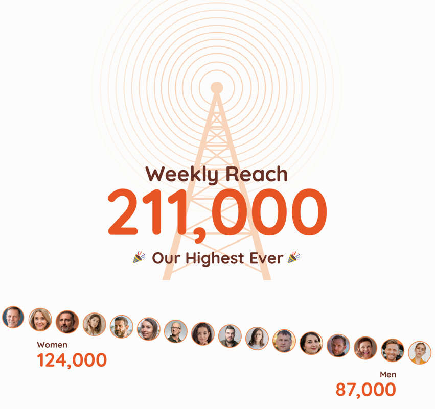 Sunshine 106.8's relaxing music mix appeals to listeners of all ages in Dublin. Sunshine 106.8's weekly (reach) audience is spread across all ages, with particular strength in the 35-54 age group, and we're the market leading music station for female listeners.