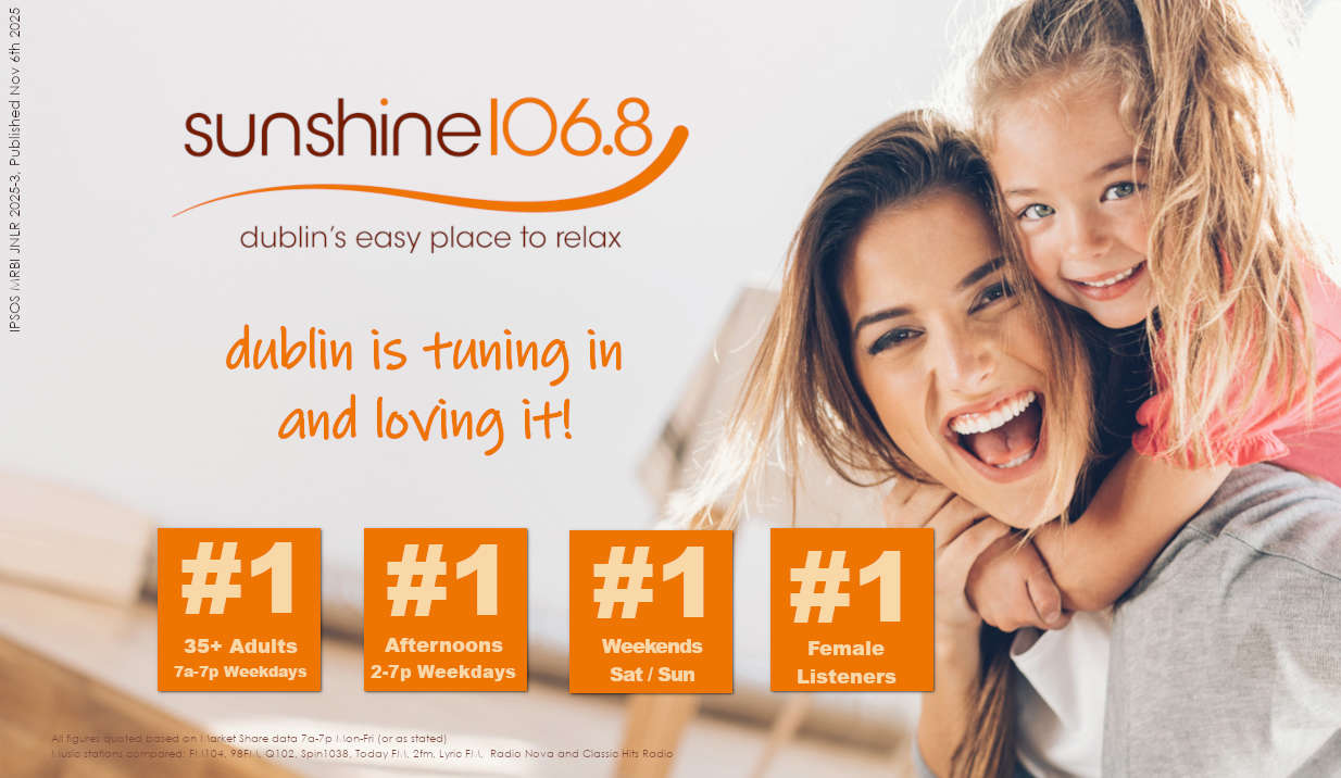 Sunshine 106.8 is ranked as the #1 music station in Dublin for 35+ Adults