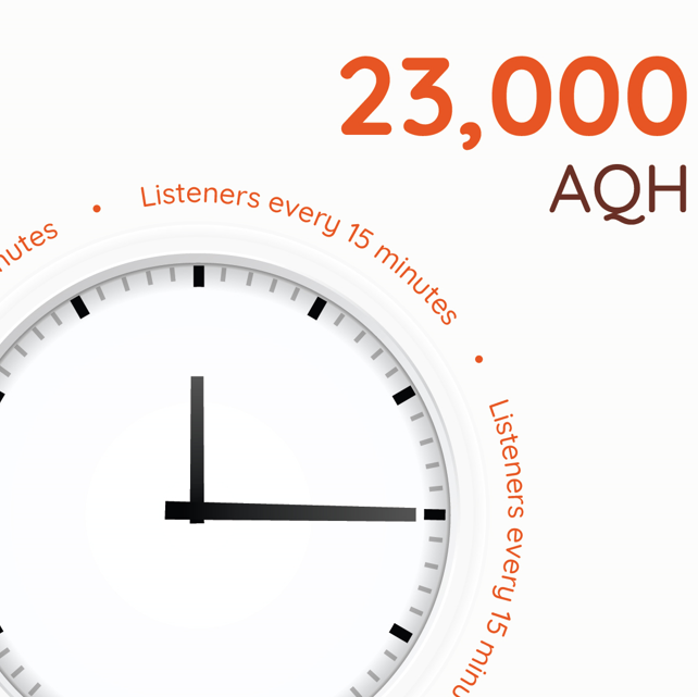 The typical amount of listeners in any given 15 minute period between 7am and 7pm (Mon-Fri) is 23,000 listeners (and even higher at the weekend!)